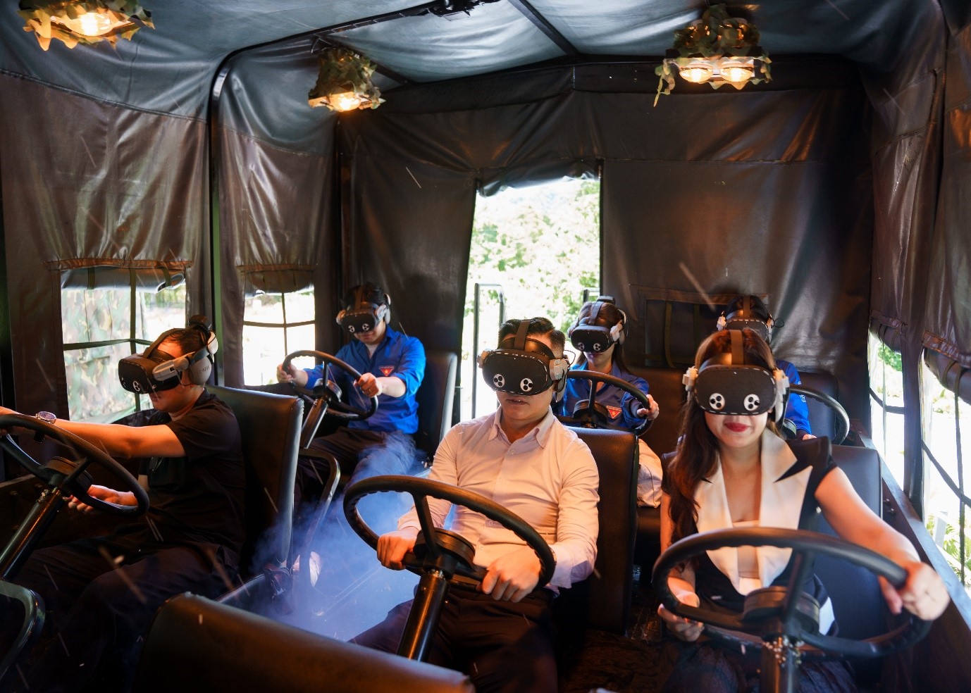 Du khách trải nghiệm công nghệ VR 9D khi ngồi vào buồng lái xe vượt tuyến lửa Trường Sơn năm xưa