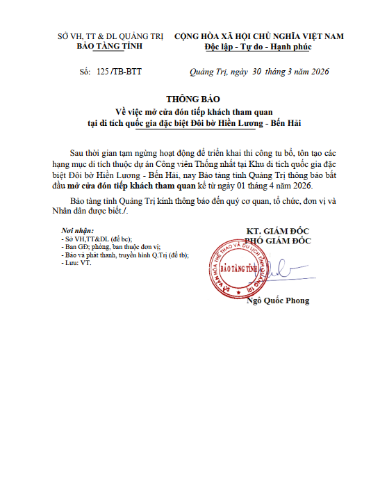 - Thông báo mở cửa đón tiếp khách tham quan tại di tích quốc gia đặc biệt Đôi bờ Hiền Lương - Bến Hải