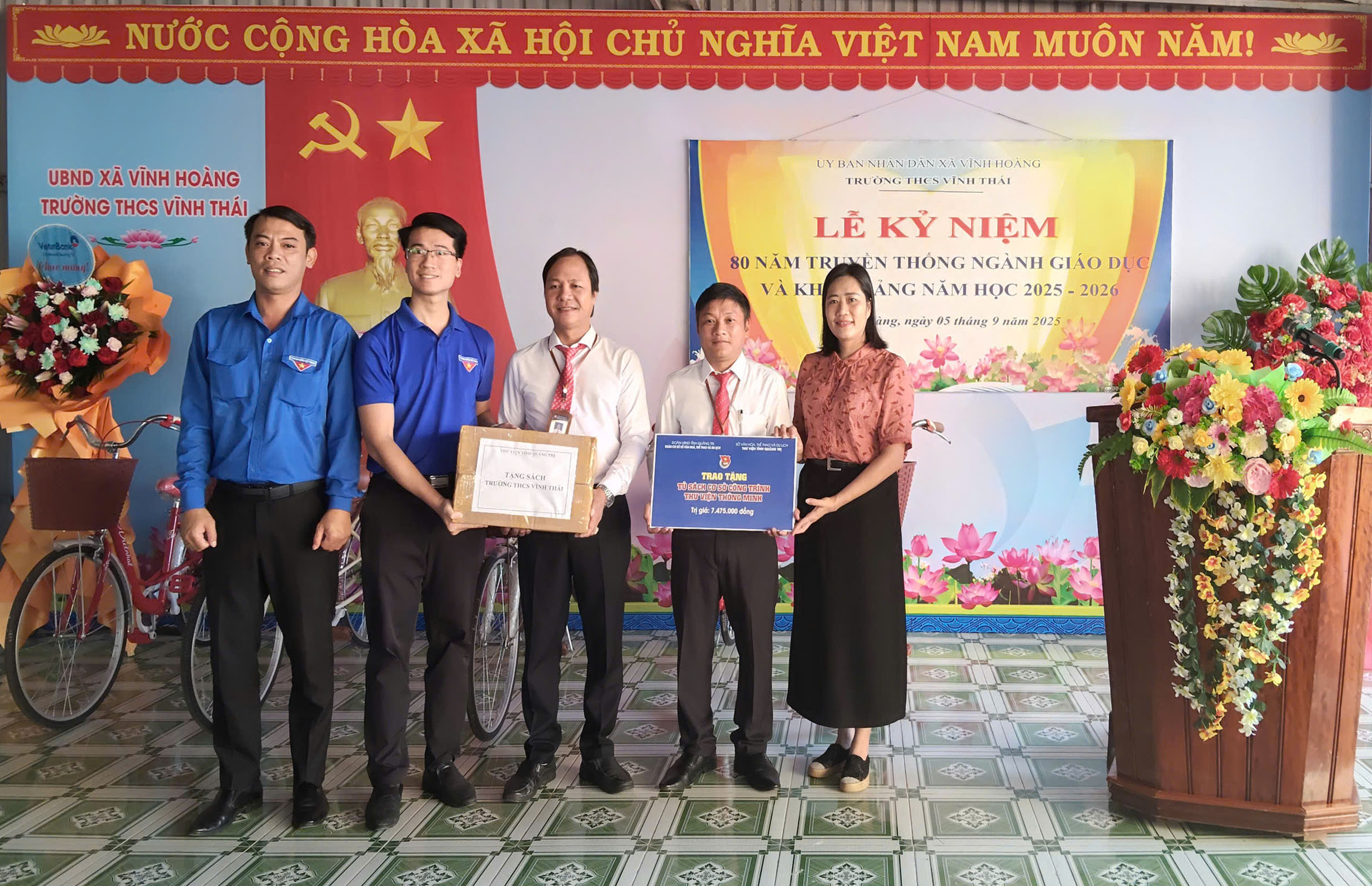 Tại buổi lễ, Thư viện tỉnh Quảng Trị đã phối hợp với Đoàn thanh niên UBND tỉnh trao tặng cho Trường THCS Vĩnh Thái 01 tủ sách cơ sở công trình “Thư viện thông minh” trị giá 7.475.000 đồng. Tủ sách được tuyển chọn đa dạng, bao gồm: sách giáo dục kỹ năng sống, sách khoa học, sách lịch sử - địa lý, văn học thiếu nhi, truyện tranh bổ ích và một số ấn phẩm tham khảo phục vụ học tập. Đây là món quà ý nghĩa nhằm khuyến khích phong trào đọc sách trong nhà trường, góp phần xây dựng và lan tỏa văn hóa đọc trong thế hệ trẻ.