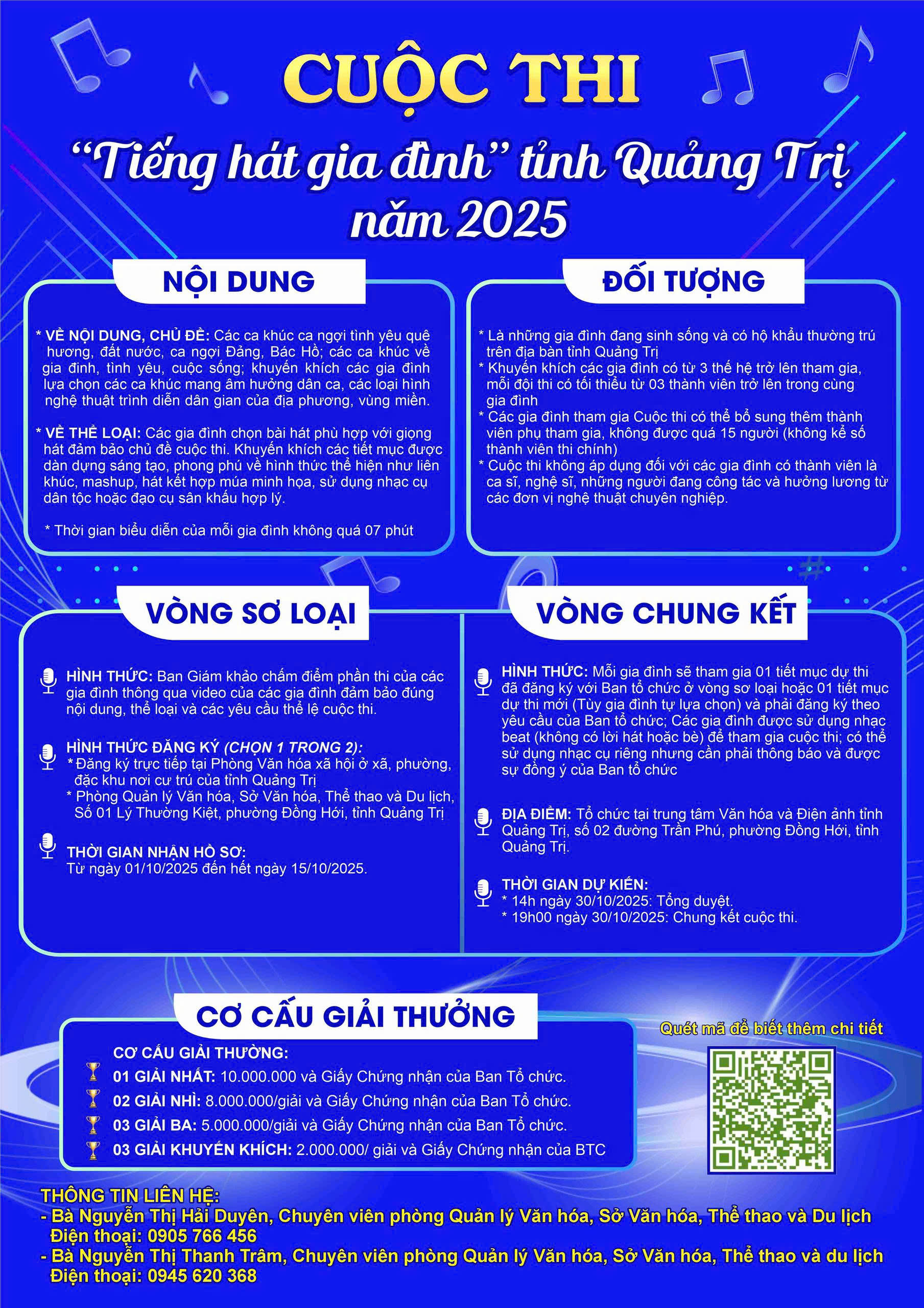 Nhằm tuyên truyền sâu rộng về vai trò, vị trí, tầm quan trọng của gia đình - nơi khởi nguồn nuôi dưỡng và phát triển những giá trị tốt đẹp của con người; Tôn vinh những giá trị sâu sắc của gia đình Việt Nam, từ đó đẩy mạnh tuyên truyền, vận động các tầng lớp nhân dân thực hiện nếp sống văn minh, gia đình văn hóa, kế thừa truyền thống tốt đẹp của gia đình Việt Nam, hướng tới xây dựng “Gia đình no ấm, bình đẳng, tiến bộ, hạnh phúc”; Tăng cường sự kết nối, gắn kết giữa các thành viên trong gia đình, góp phần xây dựng gia đình hạnh phúc; tạo điều kiện cho các gia đình được giao lưu, học hỏi, chia sẻ kinh nghiệm và kỹ năng xây dựng hạnh phúc gia đình; góp phần xây dựng quê hương Quảng Trị ngày càng giàu đẹp, văn minh. Sở Văn hoá, Thể thao và Du lịch tổ Cuộc thi tiếng hát gia đình tỉnh Quảng Trị năm 2025. Kính mời các gia đình tích cực hưởng ứng và đăng ký tham gia. Trân trọng!