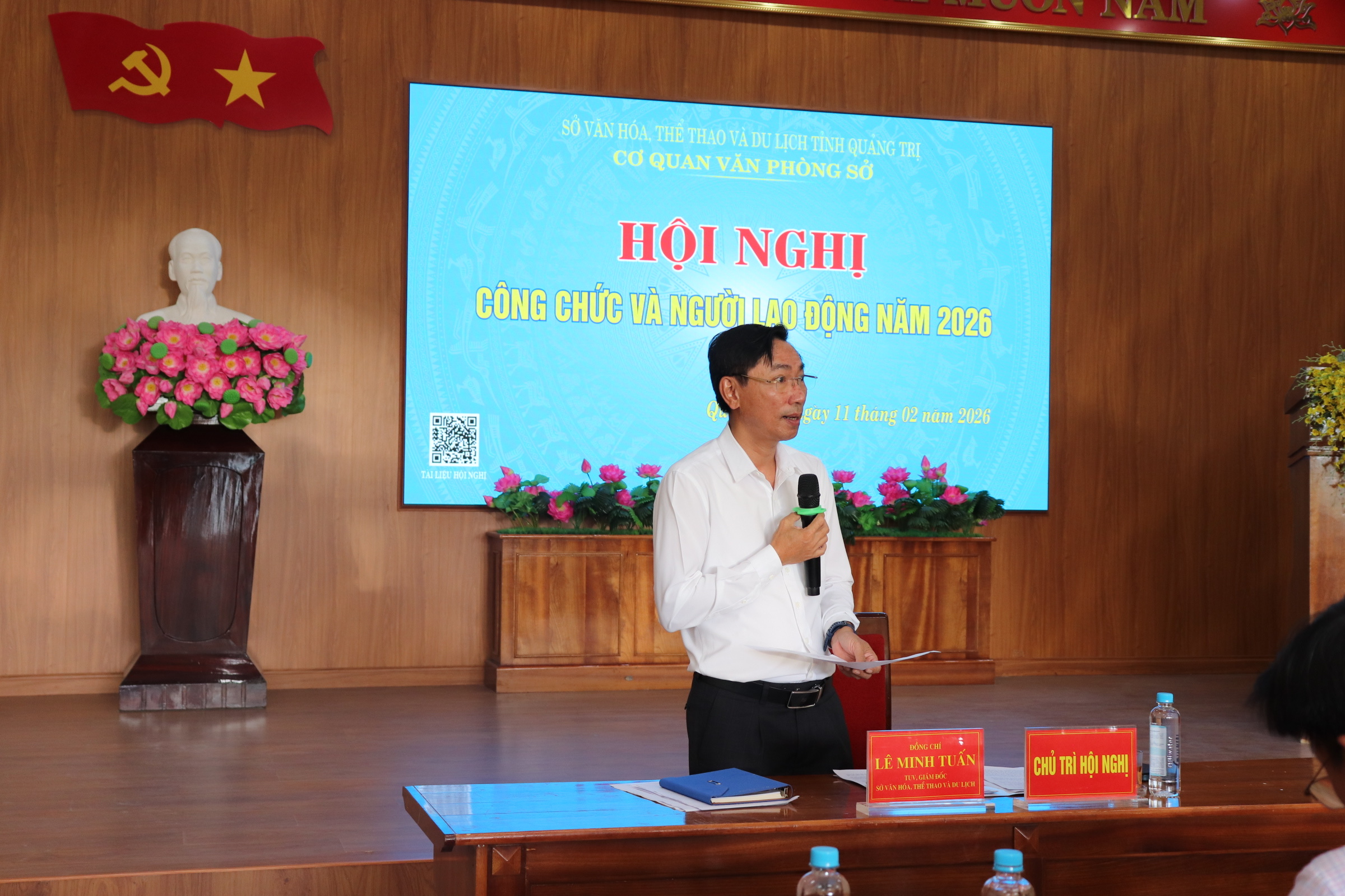 Phát biểu tại hội nghị, đồng chí Lê Minh Tuấn, Tỉnh ủy viên, Giám đốc Sở ghi nhận và biểu dương tinh thần trách nhiệm, sự nỗ lực của toàn thể cán bộ, công chức, viên chức và người lao động trong năm qua. Đồng chí nhấn mạnh, trong năm 2026, toàn ngành cần phát huy tinh thần đoàn kết, chủ động cụ thể hóa các nhiệm vụ trọng tâm để tạo bước bứt phá toàn diện. Trước hết, tập trung kiện toàn bộ máy tinh gọn, đẩy mạnh cải cách hành chính và chuyển đổi số mạnh mẽ trong lĩnh vực văn hóa, du lịch. Ngành sẽ phối hợp chặt chẽ để tổ chức thành công Lễ hội Vì Hòa bình 2026 và các ngày lễ lớn, khẳng định vị thế văn hóa của địa phương. Công tác bảo tồn di sản phải gắn liền với ứng dụng công nghệ, giải quyết hài hòa mối quan hệ giữa bảo tồn và phát triển bền vững. Về thể thao, mục tiêu cốt yếu là tổ chức thành công Đại hội TDTT tỉnh lần thứ I và đạt thành tích cao tại Đại hội Thể thao toàn quốc. Đặc biệt, phải tạo bước chuyển mạnh mẽ để đưa du lịch thực sự trở thành ngành kinh tế mũi nhọn, là khâu đột phá trong tăng trưởng kinh tế - xã hội. Việc quảng bá hình ảnh Quảng Trị cần được đẩy mạnh thông qua các sản phẩm truyền thông số và sự hợp tác chiến lược với các cơ quan báo chí Trung ương.