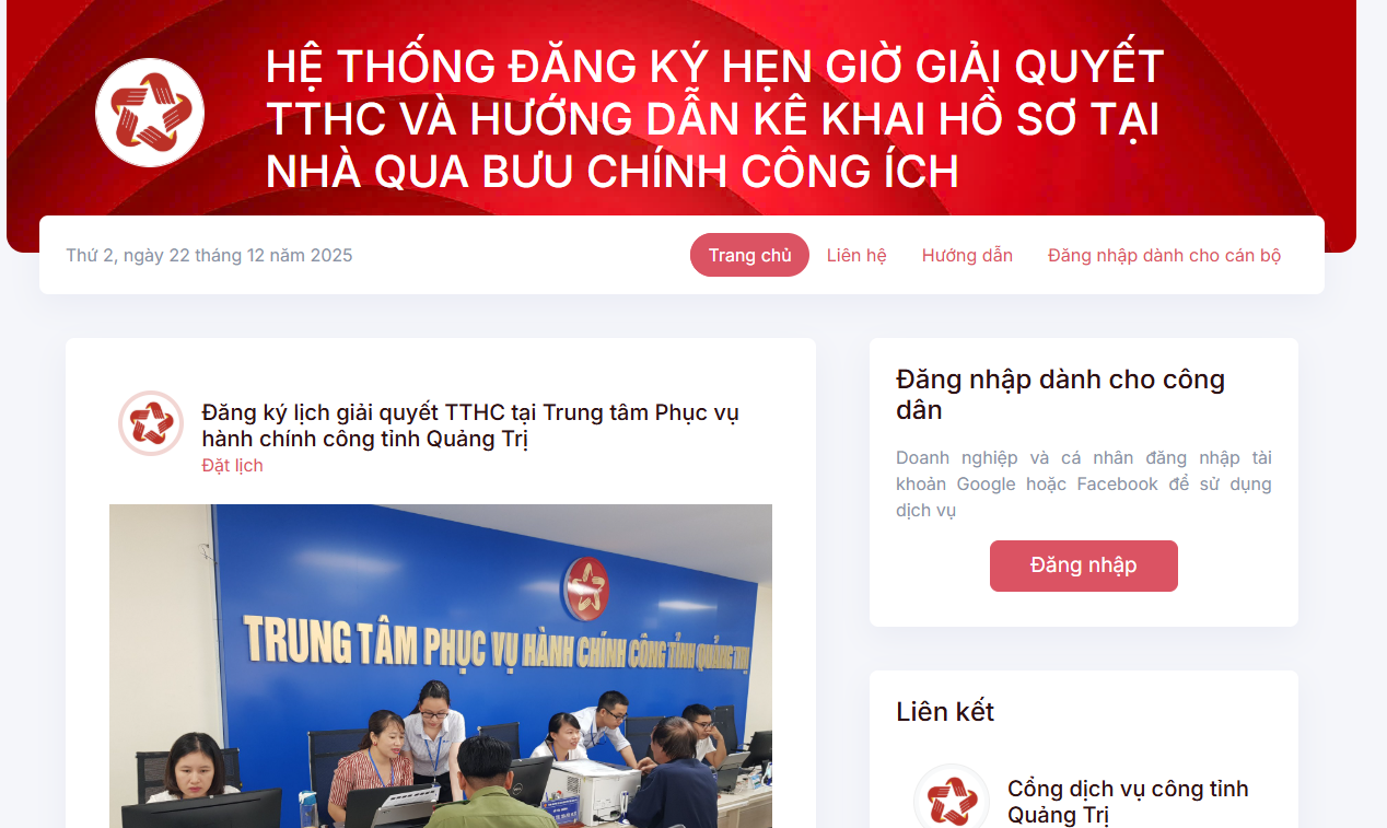 Giao diện wbsite của Hệ thống đăng ký hẹn giờ giải quyết thủ tục hành chính (https://dangkyhengio.quangtri.gov.vn)